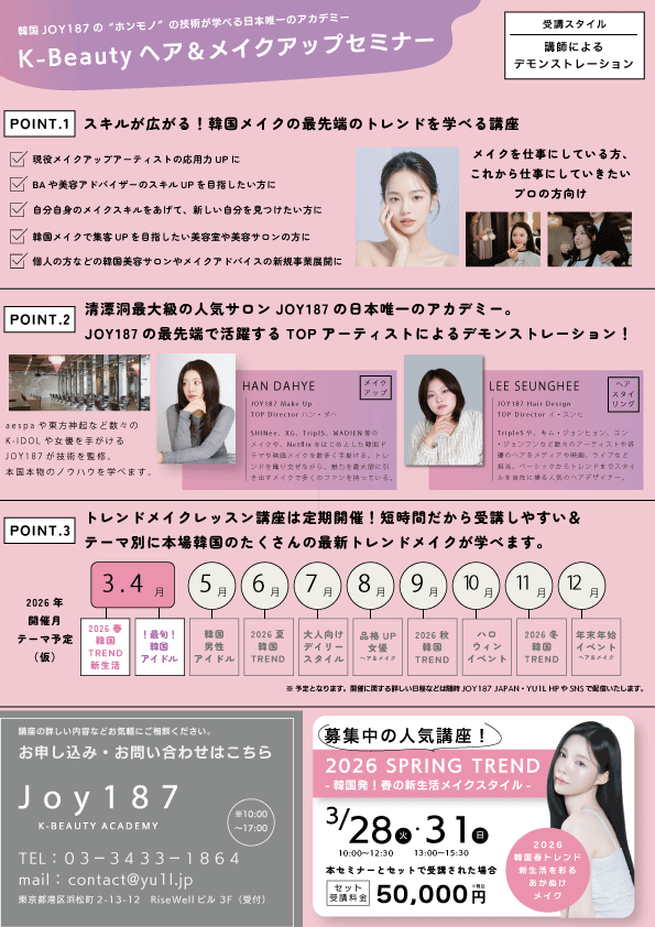 4月26日 13:00~16:00開催のK-beautyヘア&メイクアップセミナー(最新!韓国アイドルヘア&メイク-上品なツヤと存在感。最旬ヨジャドルスタイル-)の申込画面です。