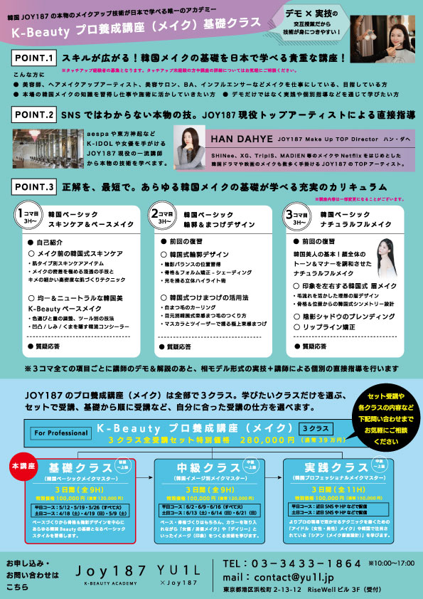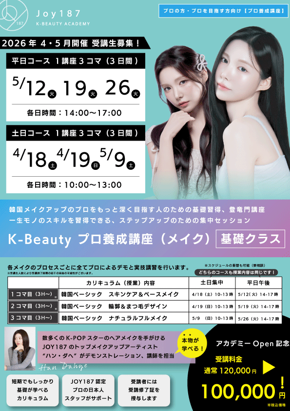 5月12日、5月19日、5月26日開催 K-beautyプロ養成講座メイク講座 火曜日コースの申込画面です。